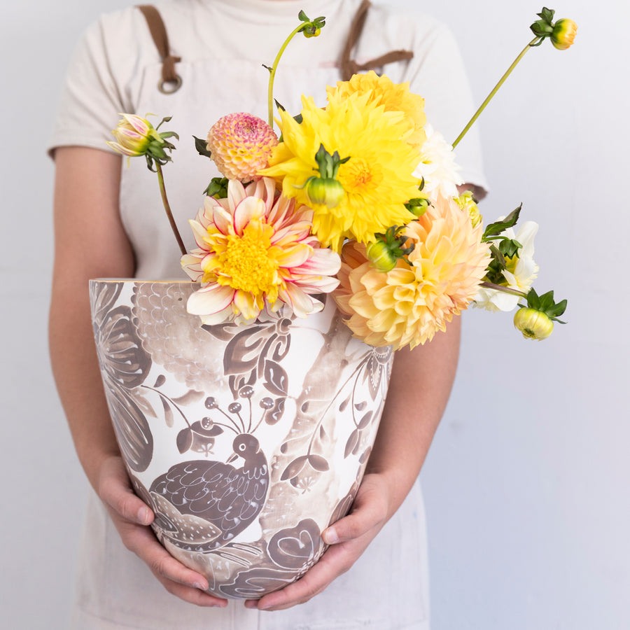 We love the bee bowl shape, inspired by bee hives, because the high sides make it a great mixing bowl, serving bowl or even as a fun vase. This large bee bowl is a fantastic object, filled with fruit, flowers, or just standing on its own. It is sure to be noticed and admired. Like all of Jill's pieces, the large bee bowl is handmade in her Boston studio. This beautiful bowl is hand thrown, then the pattern is drawn and painted by her team of professional potteristas.